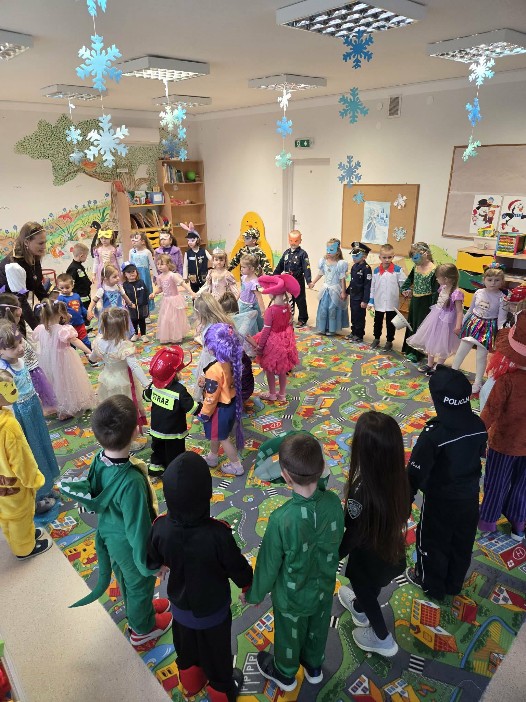 Kolorowe, bajkowe stroje, wesoła muzyka, radość, zabawa w przedszkolu.