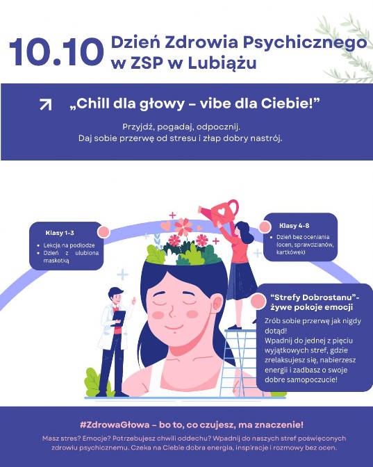 Dzisiaj obchodzimy w naszej szkole "Dzień zdrowia psychicznego". Uczniowie zapoznawali się z różnymi metodami dbania o swoje zdrowie psychiczne. Uczestniczyli w utworzonych strefach, gdzie mogli "spróbować" odpoczynku. Niektórzy tańczyli, grali w gry planszowe, inni relaksowali się słuchając muzyki relaksacyjnej. Wszystko po to, by nauczyć się jak redukować stres i emocje.
